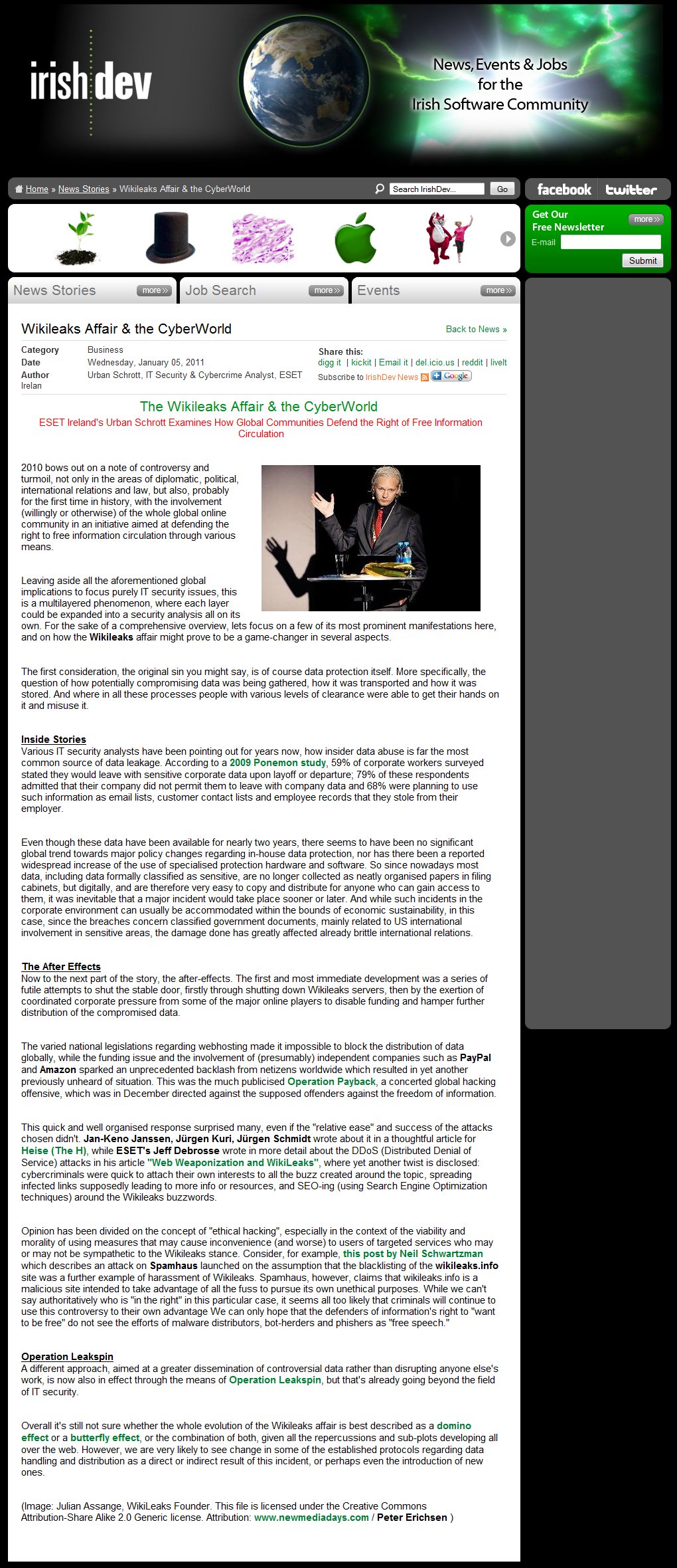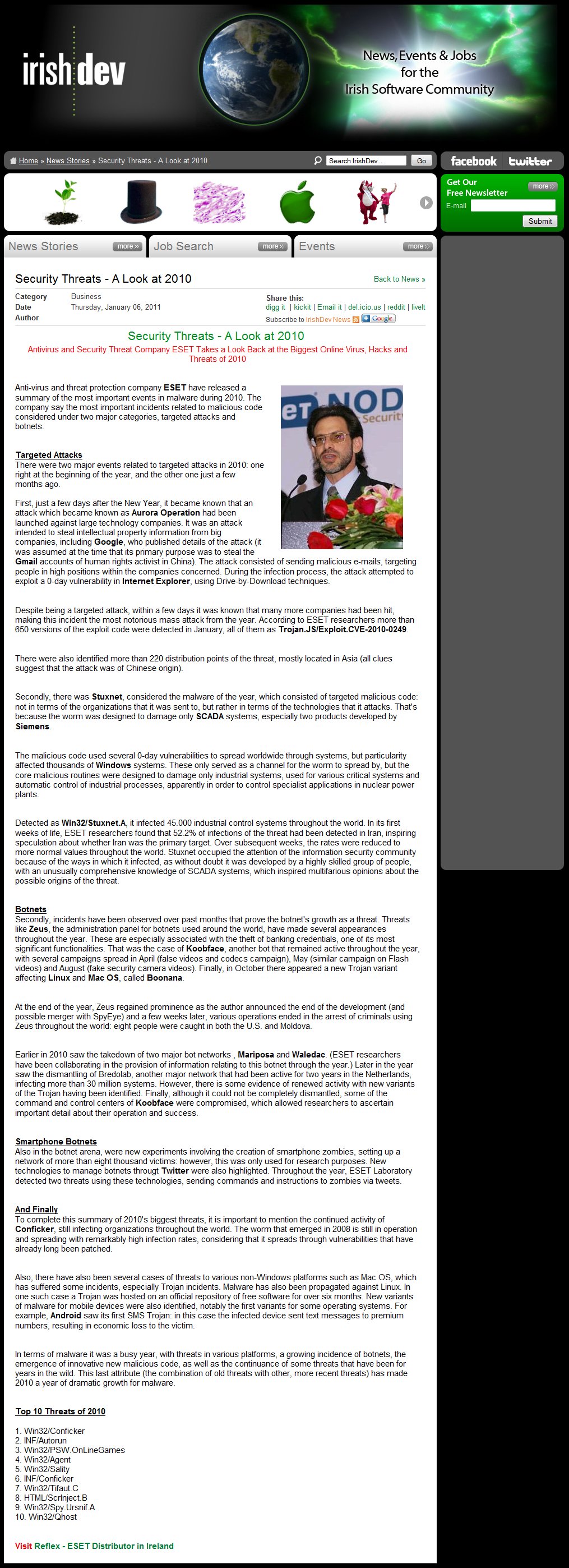 Press Clippings January 2011 Posted on April 7, 2011July 18, 2011 by ESET Ireland Click on thumbnails to view full articles. IrishDev 06.01.2011 NewsGeek 06.01.2011 IrishDev 05.01.2011 Share this: Share on X (Opens in new window) X Share on Facebook (Opens in new window) Facebook Share on LinkedIn (Opens in new window) LinkedIn Share on Tumblr (Opens in new window) Tumblr Share on Reddit (Opens in new window) Reddit Email a link to a friend (Opens in new window) Email Like Loading... Related