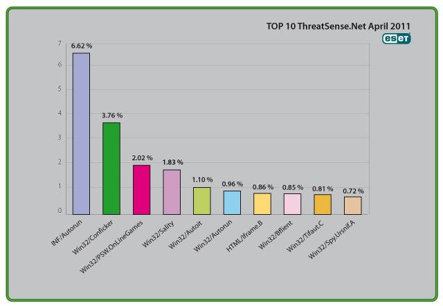 Analysis of ESET’s ThreatSense.Net®, a sophisticated malware reporting and tracking system, shows that the highest number of detections this month, with almost 6.62% of the total, was scored by the INF/Autorun class of threat.
