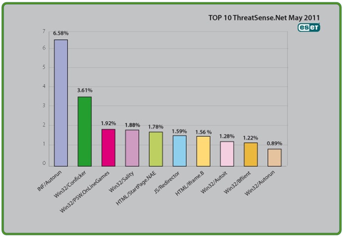 Analysis of ESET’s ThreatSense.Net®, a sophisticated malware reporting and tracking system, shows that the highest number of detections this month, with almost 6.58% of the total, was scored by the INF/Autorun class of threat.