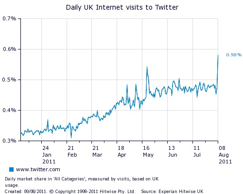 Internet and Social media were apparently an integral part of the riots. As in several cases of instigating them, as well as being one of the main sources of news and information. TNW reports that “While both the BBC and Sky News have gotten major traffic increases, it’s the story of Twitter that’s probably the most interesting. In the search for real-time news, visits to Twitter dwarfed any other visit from the UK.”