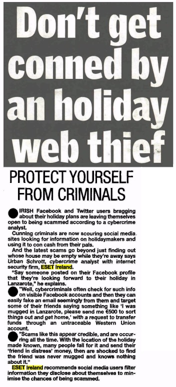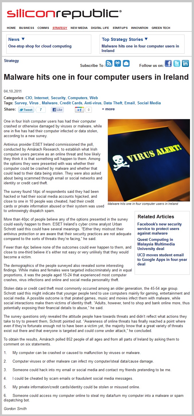 Press Clippings October 2011 Posted on October 3, 2011November 2, 2011 by ESET Ireland Click on thumbnails to view full articles. InBusiness 31.10.2011 . SiliconRepublic 4.10.2011 . SundayWorld 02.10.2011 Share this: Click to share on X (Opens in new window) X Click to share on Facebook (Opens in new window) Facebook Click to share on LinkedIn (Opens in new window) LinkedIn Click to share on Tumblr (Opens in new window) Tumblr Click to share on Reddit (Opens in new window) Reddit Click to email a link to a friend (Opens in new window) Email Like Loading... Related