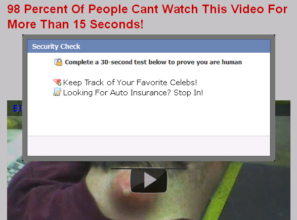 Needless to say, clicking the link is not a good idea. It’s a survey scam: if you do follow the link, it takes you to a fake Facebook page that looks as if it contains a video, but if you click the “play” button, it loads a “Share” box so that you can irritate all your friends by spamming them with the same message, and then the survey scam. In case you haven’t met these before – I know, not very likely if you have a Facebook account – it’s not there for your benefit: the scammers get paid commission for your clicks, and there is no video to “reward” you. Well, I suppose it is unwatchable, but not for its gross content…