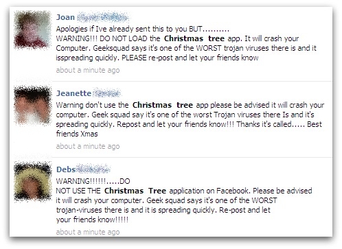 WARNING!!!!!!…..DO NOT USE THE Christmas tree app. on Facebookplease be advised it will crash your computer. Geek squad says its oneof the WORST trojan-viruses there is and it is spreading quickly.Re-post and let your friends know. THANKS PLEASE REPOST!