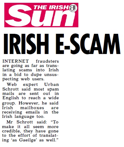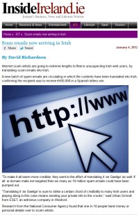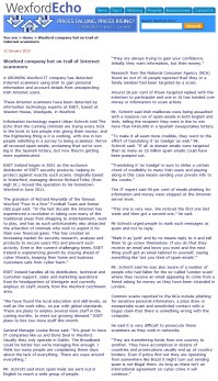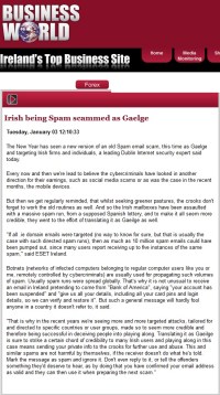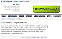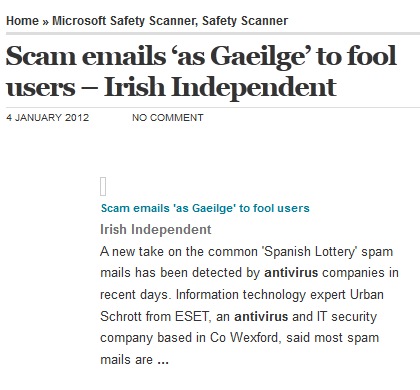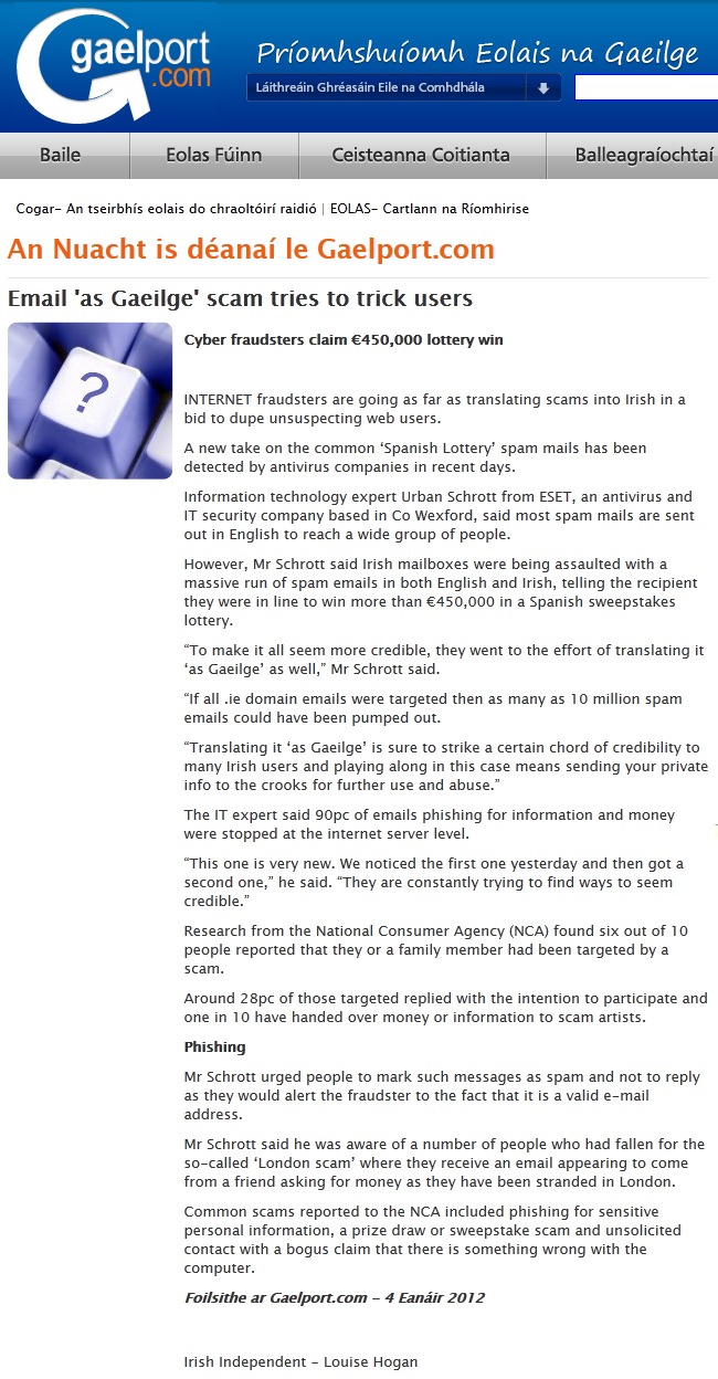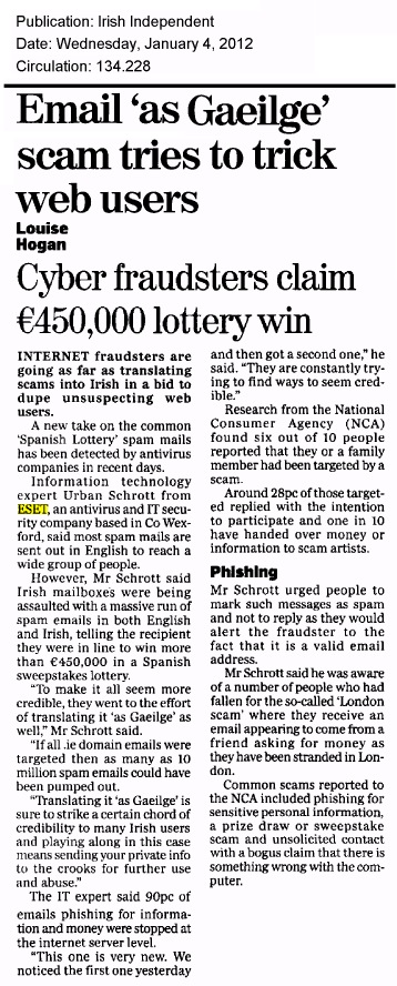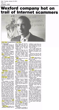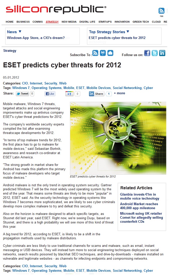 Press Clippings January 2012 Posted on January 4, 2012January 13, 2012 by ESET Ireland Click on thumbnails to view full articles. WexfordEcho 13.01.2012 . WexfordEcho.ie 13.01.2012 . ESET Threat Blog 09.01.2012 . InternetNews.ie 09.12.2012 . SoftWareGoldNet 05.01.2012 . The Irish Sun 05.01.2012 . SiliconRepublic 05.01.2012 . Gaelport 04.01.2012 . Cogar.ie 04.01.2012 . SafetyScanner.com 04.01.2012 . EmailAbuse.org 04.01.2012 . Inside Ireland 04.01.2012 . Irish Independent Online 03.01.2012 . Irish Independent 03.01.2012 . Business World 03.01.2012 Share this: Click to share on X (Opens in new window) X Click to share on Facebook (Opens in new window) Facebook Click to share on LinkedIn (Opens in new window) LinkedIn Click to share on Tumblr (Opens in new window) Tumblr Click to share on Reddit (Opens in new window) Reddit Click to email a link to a friend (Opens in new window) Email Like Loading... Related