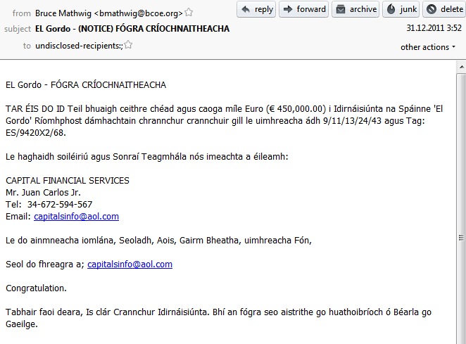 Every now and then we’re lead to believe the cybercriminals have looked in another direction for their earnings, such as social media scams or as was the case in the recent months, the mobile devices. But then we get regularly reminded, that whilst seeking greener pastures, the crooks don’t forget to work the old routines as well. And so the Irish mailboxes have been assaulted with a massive spam run, from a supposed Spanish lottery, and to make it all seem more credible, they went to the effort of translating it as Gaeilge as well.