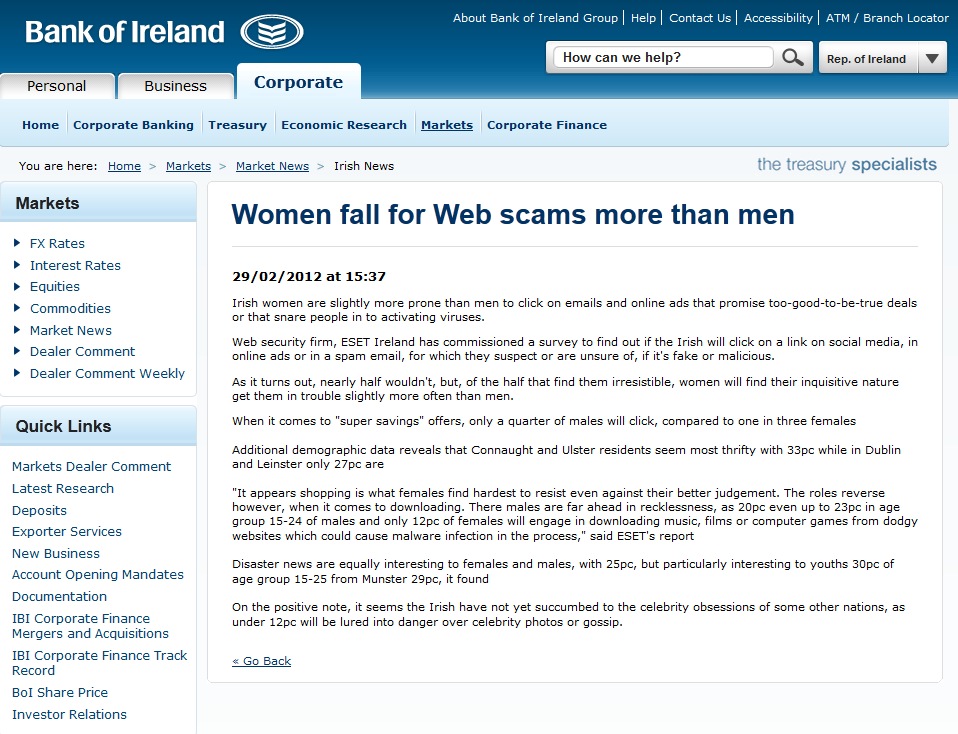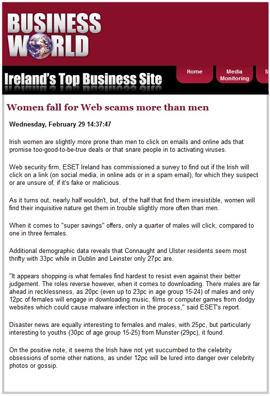 Press Clippings February 2012 Posted on February 14, 2012March 1, 2012 by ESET Ireland Click on thumbnails to view full articles. Bank of Ireland 29.02.2012 . Business World 29.02.2012 . Daily Irish Mail 14.02.2012 . Irish Daily Star 14.02.2012 . Business World 13.02.2012 . SC Magazine 07.02.2012 Share this: Click to share on X (Opens in new window) X Click to share on Facebook (Opens in new window) Facebook Click to share on LinkedIn (Opens in new window) LinkedIn Click to share on Tumblr (Opens in new window) Tumblr Click to share on Reddit (Opens in new window) Reddit Click to email a link to a friend (Opens in new window) Email Like Loading... Related