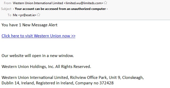 Western Union’s Dublin address is added to reassure the Irish computer users the warning is legitimate and to make them click on the link that is supposed to reveal their Western Union message alert. Upon clicking the link the site requires the user to log in with their credentials, and by doing that the bad guys get hold of the username and password, enabling them to log into the real Western Union in the victim’s name and abuse the service for their purposes.