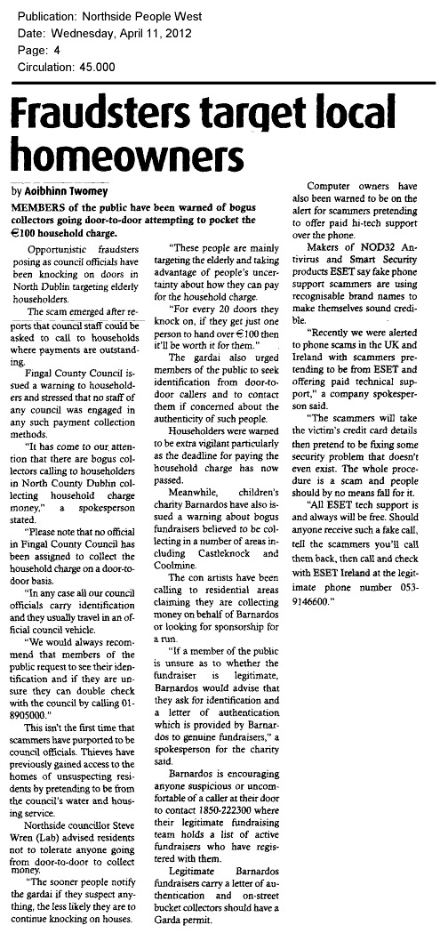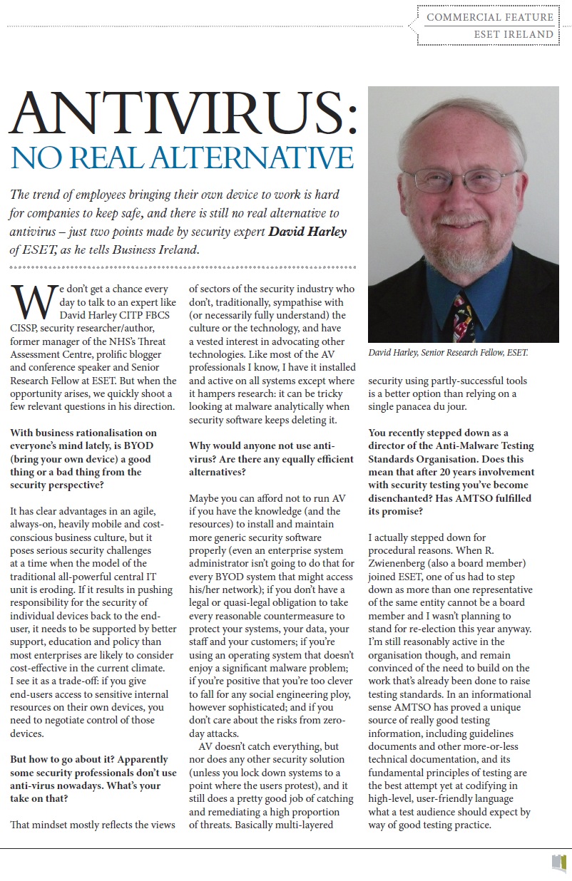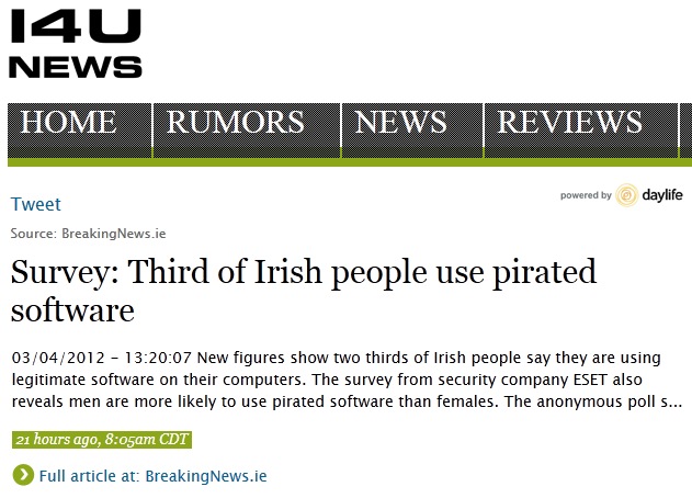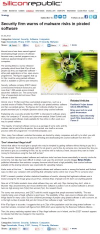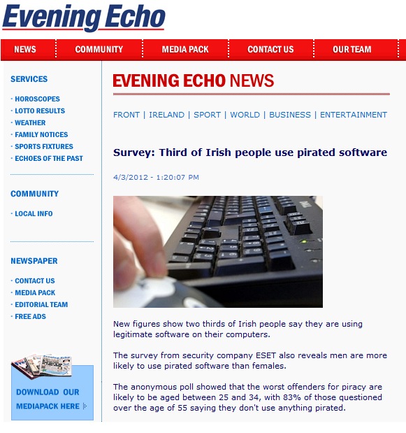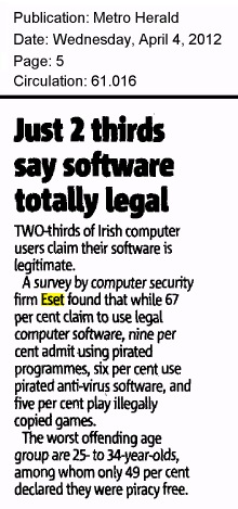 Press Clippings April 2012 Posted on April 4, 2012April 30, 2012 by ESET Ireland Click on thumbnails to view full articles. The Irish Mail on Sunday 29.04.2012 . Northside People West 11.04.2012 . InBusiness spring 2012 . Dublin People 09.04.2012 . SiliconRepublic 05.04.2012 . Metro Herald 04.04.2012 . I4U 03.04.2012 . WLR FM 03.04.2012 . Corkpedia 03.04.2012 . Breaking News.ie 03.04.2012 . Evening Echo 03.04.2012 . Irish Examiner 03.04.2012 . Eircom 03.04.2012 . Business Ireland spring 2012 . Share this: Click to share on X (Opens in new window) X Click to share on Facebook (Opens in new window) Facebook Click to share on LinkedIn (Opens in new window) LinkedIn Click to share on Tumblr (Opens in new window) Tumblr Click to share on Reddit (Opens in new window) Reddit Click to email a link to a friend (Opens in new window) Email Like Loading... Related