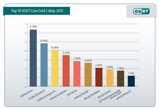 Throughout May, HTML/ScrInject.B was dethroned as top malware worldwide and Europe making the way for the big comeback of INF/Autorun – with a 6.36% infection rate globally and 4.99% in Europe. ESET malware statistics based on ESET Live Grid® – a cloud-based malware collection system utilizing data from users of ESET solutions worldwide has put HTML/Iframe.B in second spot, both in the world (4.84%) and in Europe (4.81%). HTML/ScrInject.B was recorded in third position with 4.09% infection rate worldwide and 4.35% in Europe.