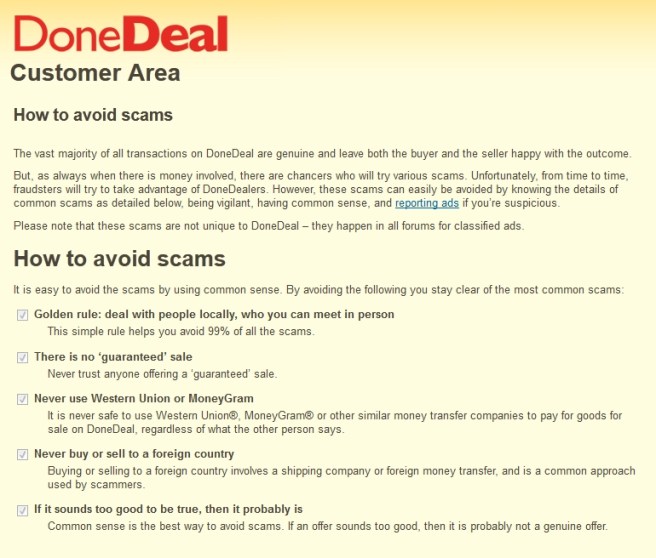 (see all DoneDeal’s safety advice at their website: http://help.donedeal.ie/safety and more info on avoiding scammers is available at: http://blog.donedeal.ie/articles/avoid-text-and-email-scammers/)