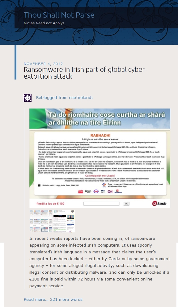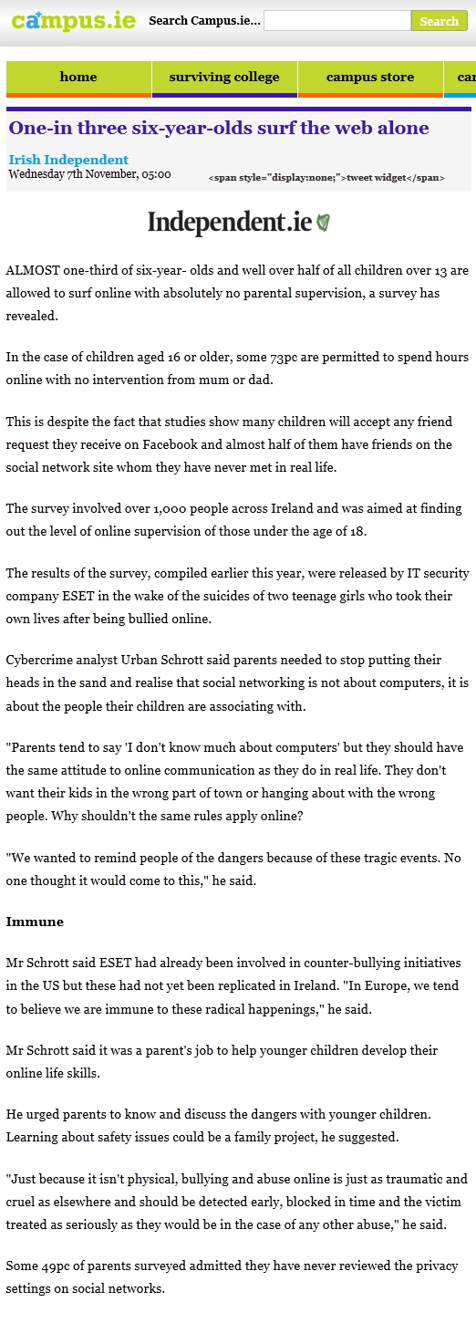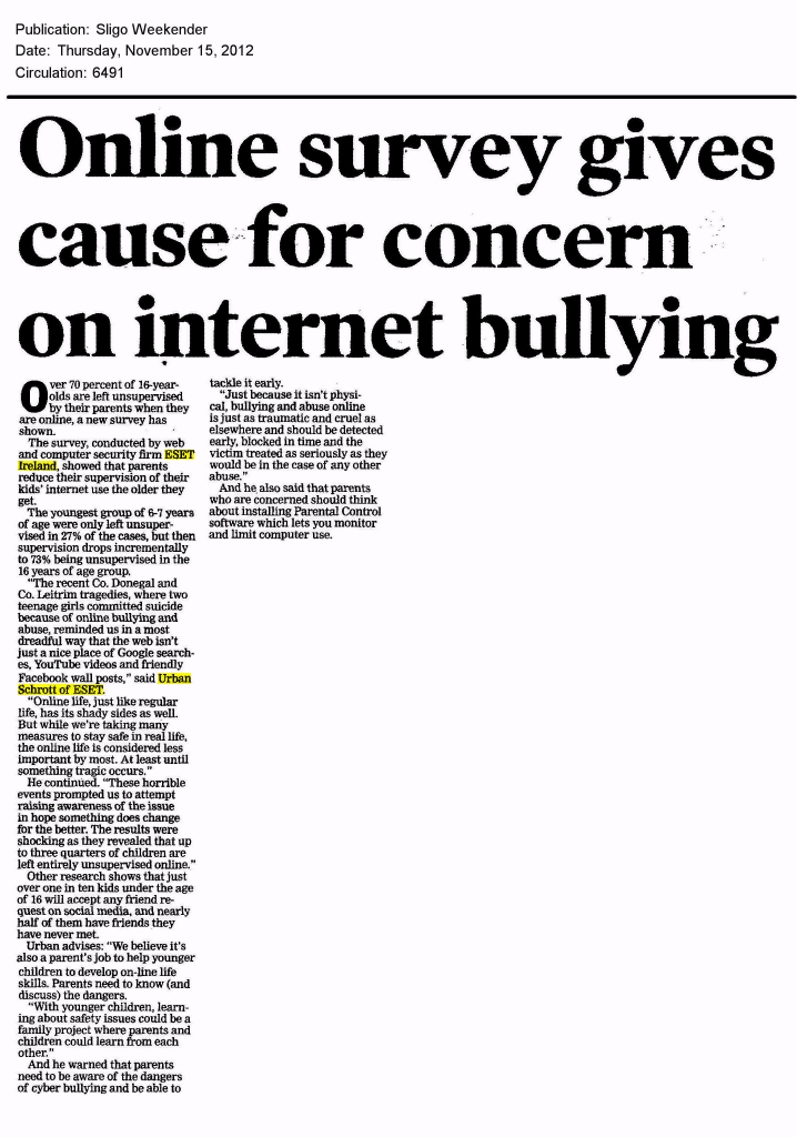 Press Clippings November 2012 Posted on November 2, 2012November 16, 2012 by ESET Ireland Click on thumbnails to view full articles. Sligo Weekender 15.11.2012 . Campus.ie 07.11.2012 . Independent.ie 07.11.2012 . Irish Independent 07.11.2012 . Thou Shallt Not Parse 04.11.2012 . Point 2 Security 02.11.2012 . M2Woman Autumn 2012 . IT Secure Site 02.11.2012 . TechCentral 01.11.2012 Share this: Click to share on X (Opens in new window) X Click to share on Facebook (Opens in new window) Facebook Click to share on LinkedIn (Opens in new window) LinkedIn Click to share on Tumblr (Opens in new window) Tumblr Click to share on Reddit (Opens in new window) Reddit Click to email a link to a friend (Opens in new window) Email Like Loading... Related