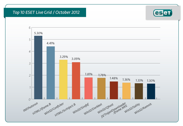 Analysis of ESET Live Grid, a sophisticated malware reporting and tracking system, shows that the highest number of detections this month, with almost 5.30% of the total, was scored by the INF/Autorun class of threat.