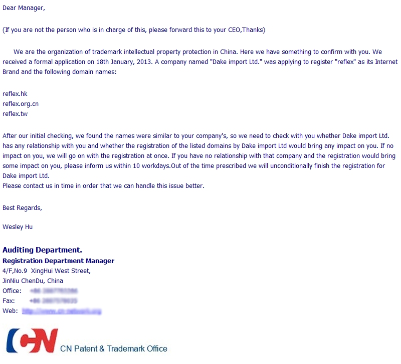 How does the actual scam work? If I were to reply to the above message, the organisation behind the scam would notify me that unless I register my domain names with them for a fee, they will be given to the other party. I might even have to participate in a fake bidding war against the imaginary company trying to register my domain names. If I ask for the contact information for the company trying to register my domains, I will be told it cannot be given out “for privacy reasons.” And, of course, since it is a fictitious company name, I will not be able to find it by searching on it.