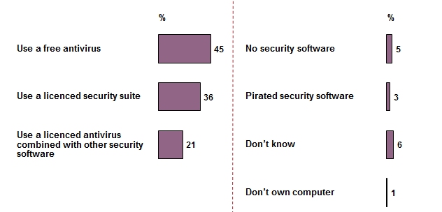 A multiple answer poll conducted among 1000 Irish adults in January has revealed a few interesting things. A very positive one is that the vast majority of computers in Ireland are protected by some form of security software and only 5% use nothing at all, while a 3% minority is mad enough to use pirated antivirus – as that makes about as much sense as having robbers guard jewellers and bank vaults.