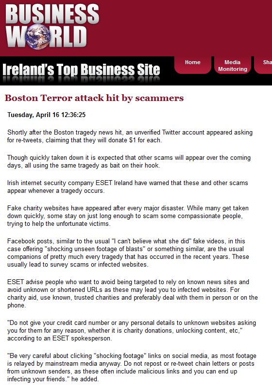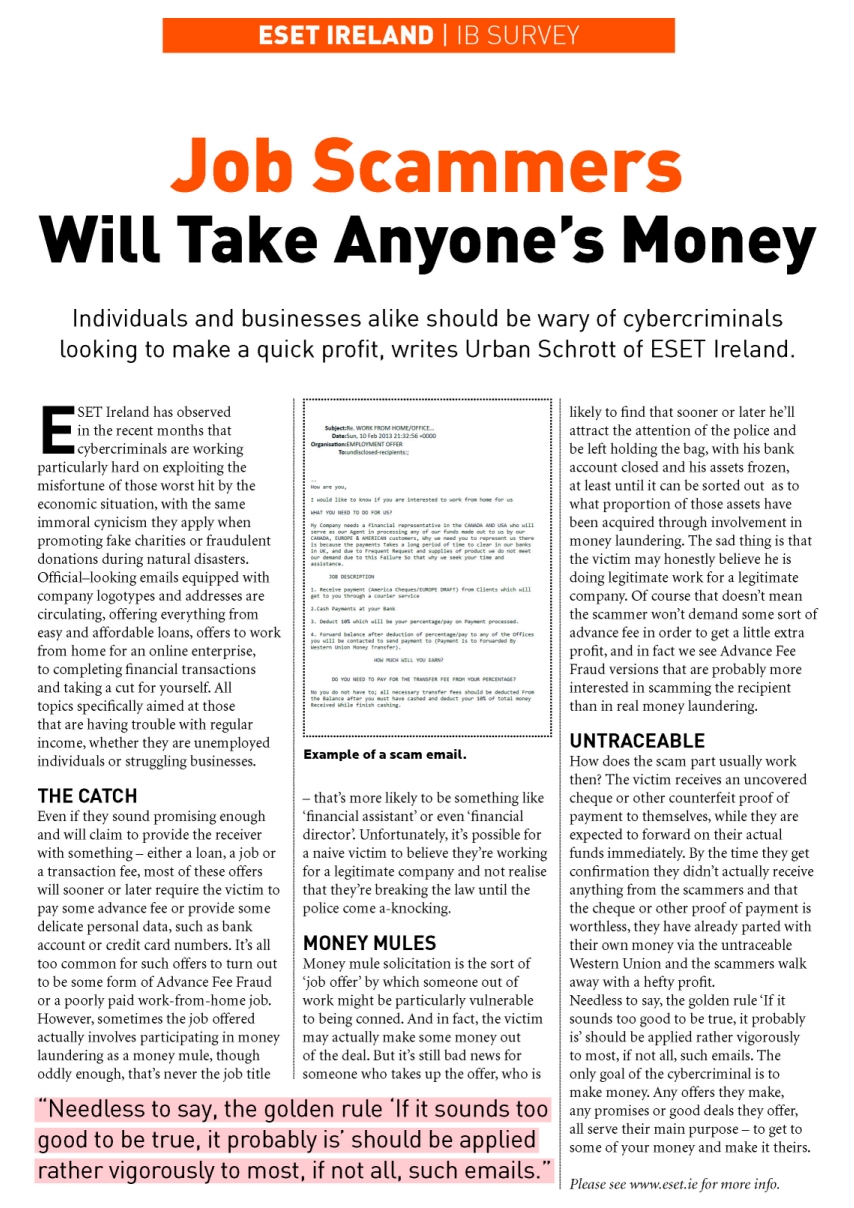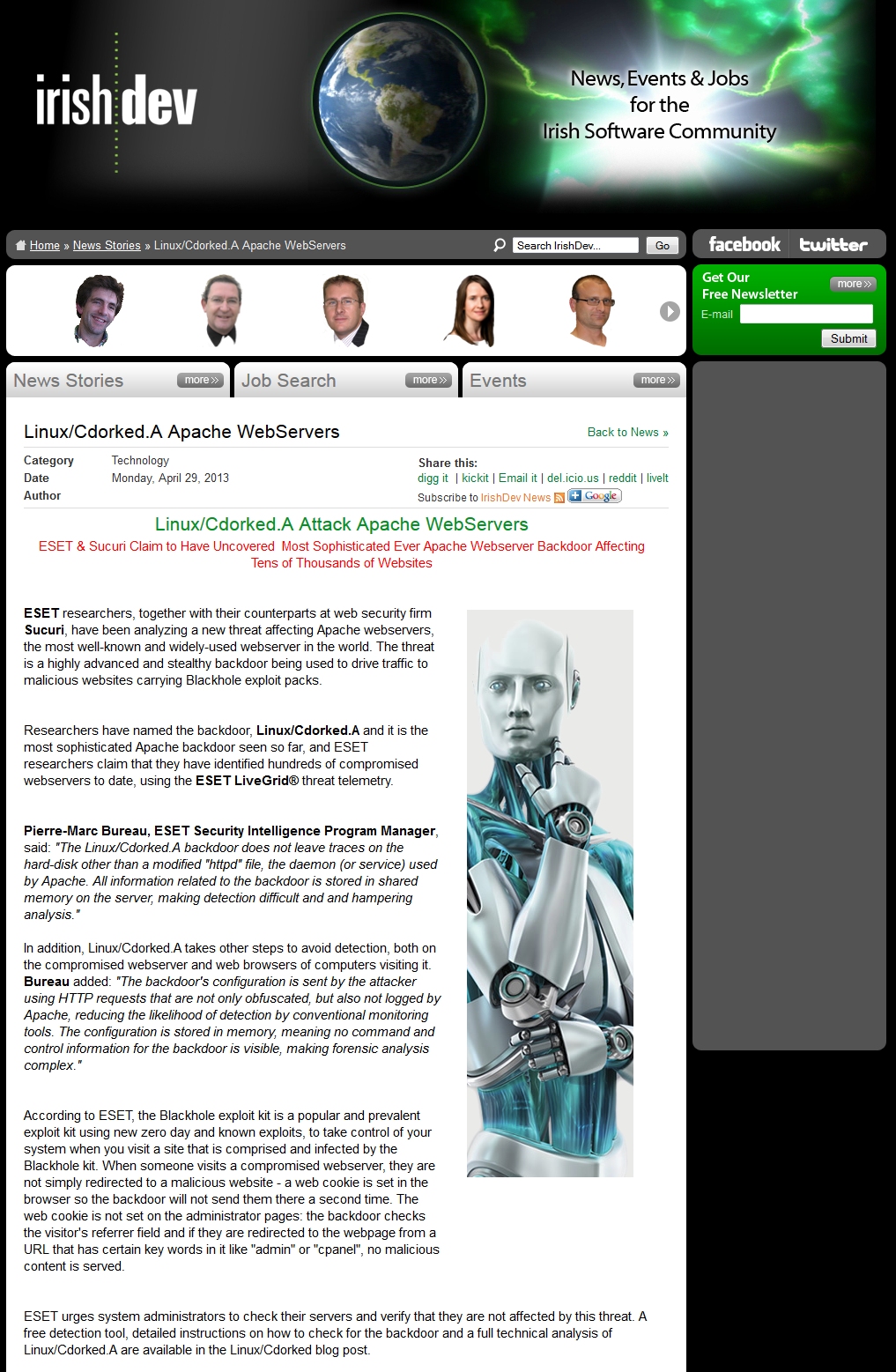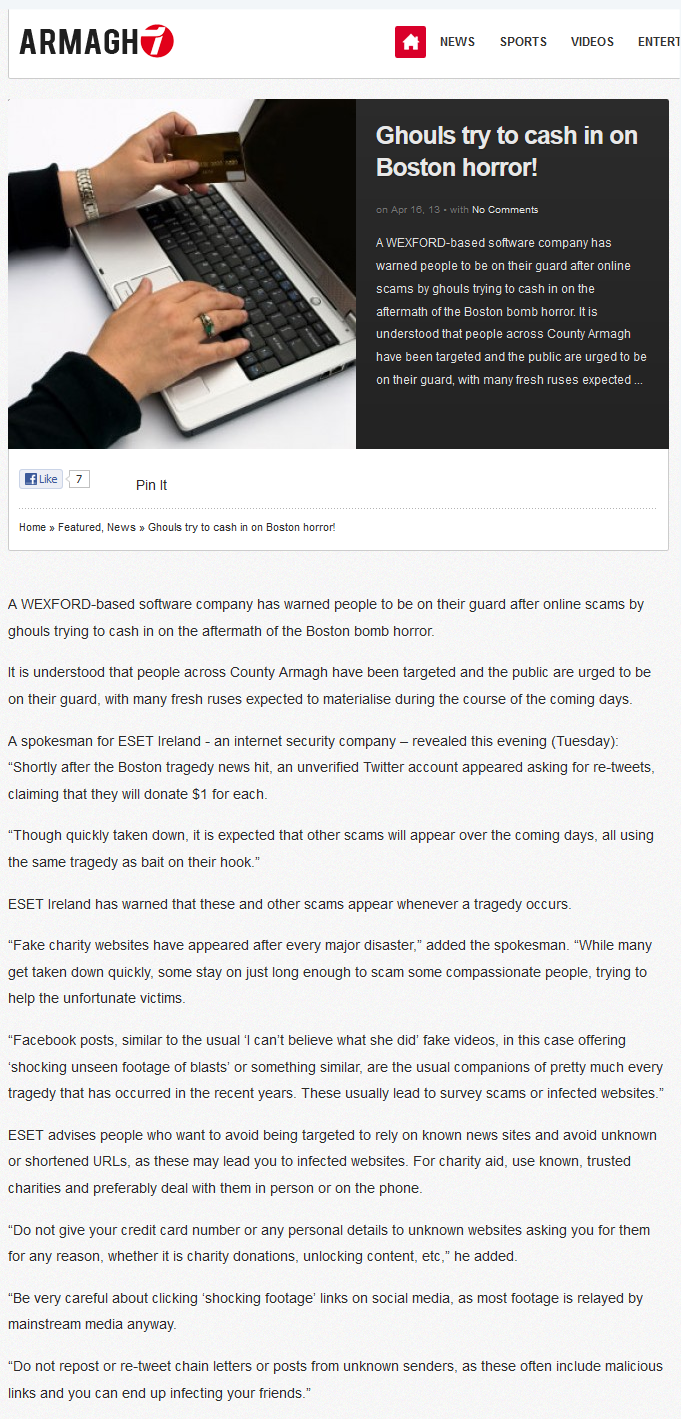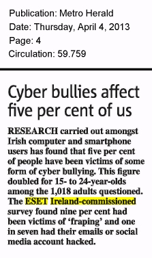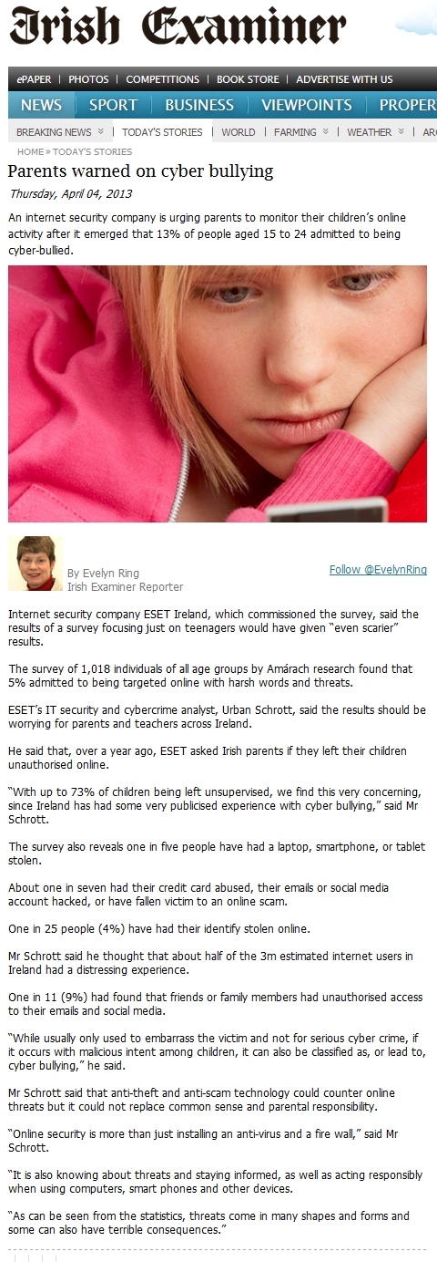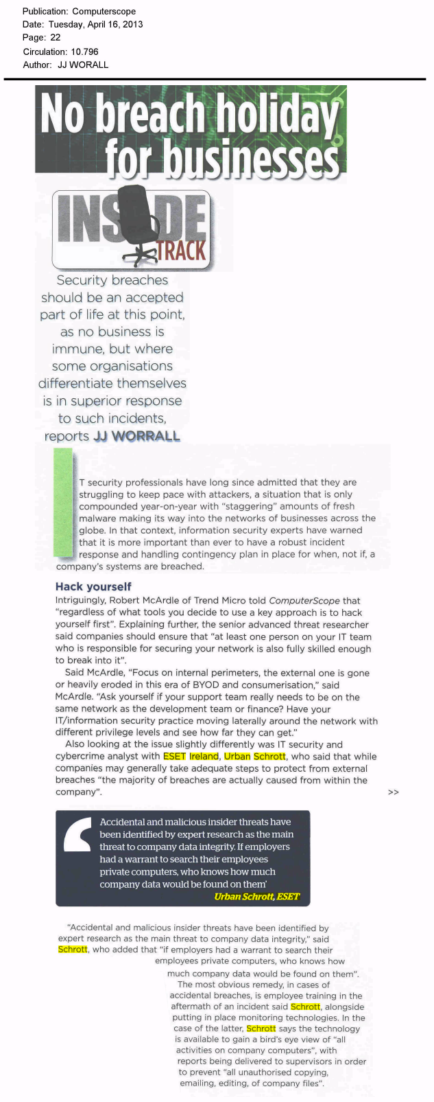 Press Clippings April 2013 Posted on April 2, 2013April 30, 2013 by ESET Ireland Click on thumbnails to view full articles. . IT Secure Site 29.04.2013 . IrishDev 29.04.2013 . Armagh I 16.04.2013 . Computerscope 16.04.2013 . Irish Daily Star 17.04.2013 . Business World 16.04.2013 . Sunday Business Post 07.04.2013 . IrishDev 05.04.2013 . Irish Examiner online 04.04.2013 . Irish Examiner 04.04.2013 . Metro Herald 04.04.2013 . Irish Daily Mail 04.04.2013 . Business World 03.04.2013 . InBusiness Spring 2013 . Business Ireland 2013 . Share this: Click to share on X (Opens in new window) X Click to share on Facebook (Opens in new window) Facebook Click to share on LinkedIn (Opens in new window) LinkedIn Click to share on Tumblr (Opens in new window) Tumblr Click to share on Reddit (Opens in new window) Reddit Click to email a link to a friend (Opens in new window) Email Like Loading... Related