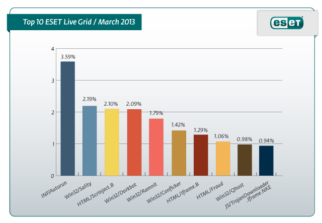 Analysis of ESET LiveGrid®, a sophisticated malware reporting and tracking system, shows that the highest number of detections this month, with almost 3.59% of the total, was scored by the INF/Autorun class of threat.