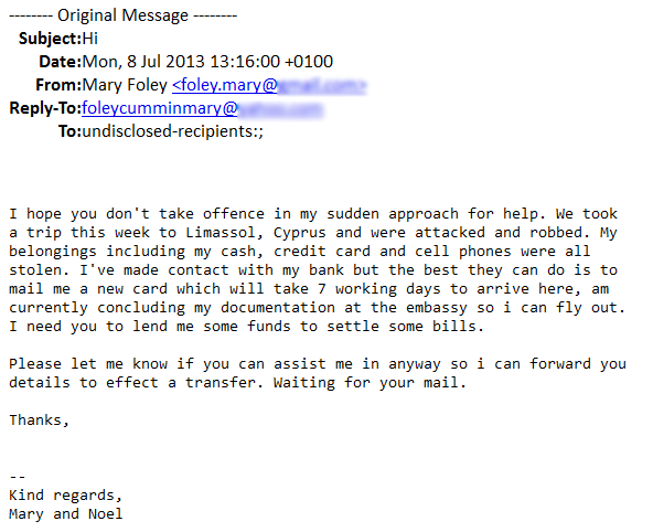This sort of “stranded abroad” scam has been around for a while, and because at first the “friend in need” was usually stuck in London, it even acquired the name “londoning”. But, as the cybercriminals have learned that people respond better to things they’re familiar with, they now tend to customise each scam, to target specific countries and victims there. Sometimes, when someone’s email account is hijacked, their friends might also receive such emails, with actual info of their friend included, which makes it even harder to spot it’s actually someone else taking advantage of people willing to help.