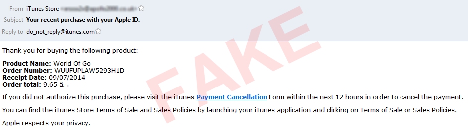 An email pretending to be from iTunes, thanking you for purchasing “World Of Go” for €9.65 , then adding “If you did not authorize this purchase, please visit the iTunes Payment Cancellation Form within the next 12 hours in order to cancel the payment,” which requires you to “log in” to the fake iTunes site.