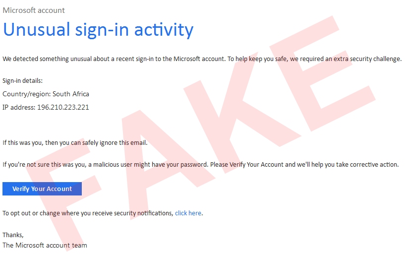 An email abusing Microsoft’s name, with the subject line “Microsoft account unusual sign-in activity” that claims they detected unusual sign-in activity into your account, supposedly from South Africa, which is meant to make people suspicious, then offering a solution “If you’re not sure this was you, a malicious user might have your password. Please Verify Your Account and we’ll help you take corrective action.” Of course the only action they’ll be taking is signing into your account with the login details you just provided.