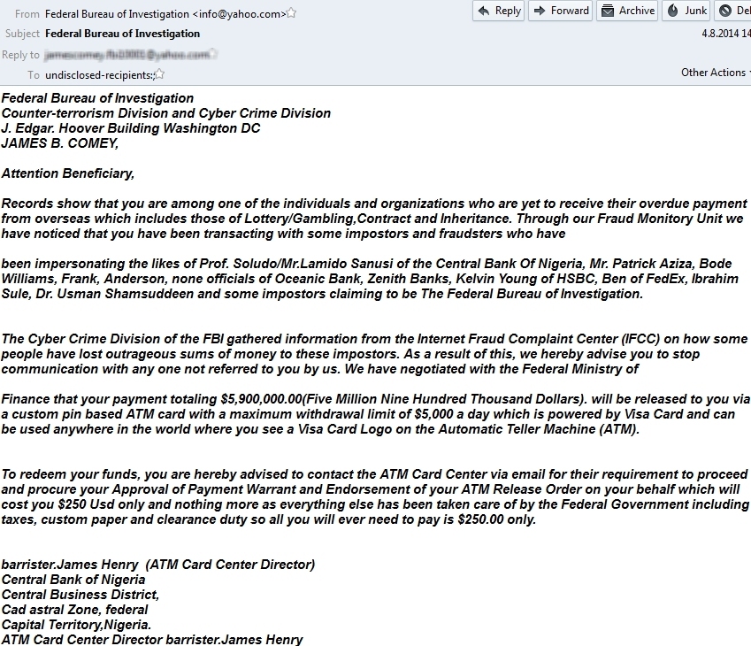 But my personal favourite this week is the FBI one. The gist of it is, that FBI is warning us “that you are among one of the individuals and organizations who are yet to receive their overdue payment from overseas which includes those of Lottery / Gambling, Contract and Inheritance. Through our Fraud Monitory Unit we have noticed that you have been transacting with some impostors and fraudsters” and that “The Cyber Crime Division of the FBI gathered information from the Internet Fraud Complaint Center (IFCC) on how some people have lost outrageous sums of money to these impostors”, and because those wicked fraudsters are out to get us, we should contact barrister James Henry of the Central Bank of Nigeria directly, with all our banking details, so he can transfer us $5.9 million that we are “owed”. Scammers trying to scam us by warning us of scammers. Cute, isn’t it?
