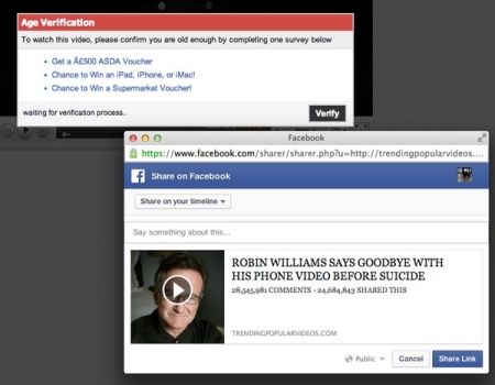 The scam, which has spread widely on Facebook, claims to show a “goodbye” video made by Robin Williams before he committed suicide last week. However, when Facebook users click on the link they are told to share it with their online friends and complete a survey before they can watch the promised video. Each completed survey earns the scammers a small amount of money.