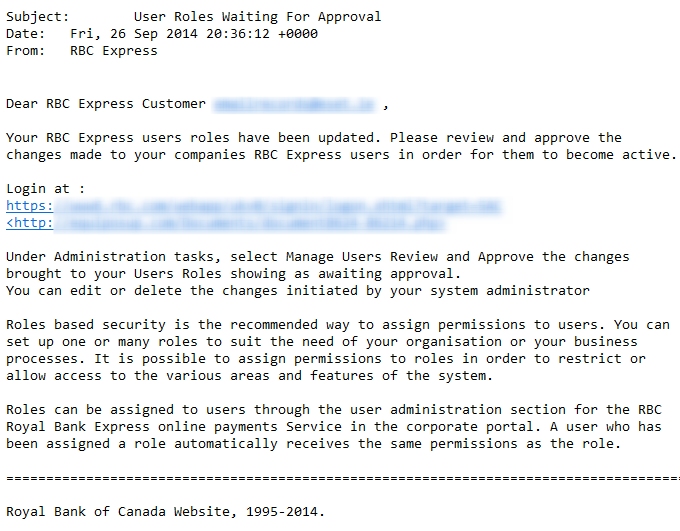 The second one is even a bit more malicious. This one claims to be from the Royal Bank of Canada, and tries to lure potential victims to click on links, with the promise of updates to their user accounts. But the links are actually infected with a drive-by download of Win32/TrojanDownloader.Waski.A trojan, a nasty piece of malware that makes computers vulnerable to cybercriminals, who can infect them with password-grabbing or bank-account-stealing spyware or use them to dispatch more malware or various illegal content: