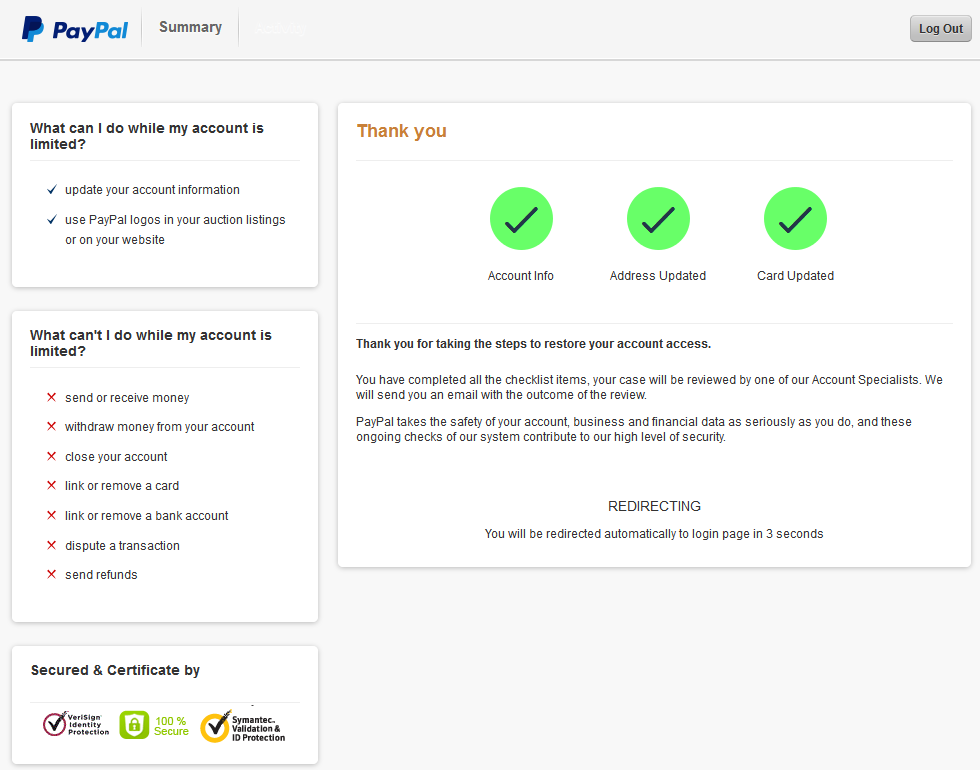 “When I opened the emails and read the contents I followed the instructions to the log in section. It didn’t raise a red flag as it appeared identical to the PayPal site I am used to using,” continued Christy. “I again followed the instructions and entered my user name and password and this navigated me to the main PayPal home screen, again identical to PayPals own site. I then entered my card details and confirmed my status.”