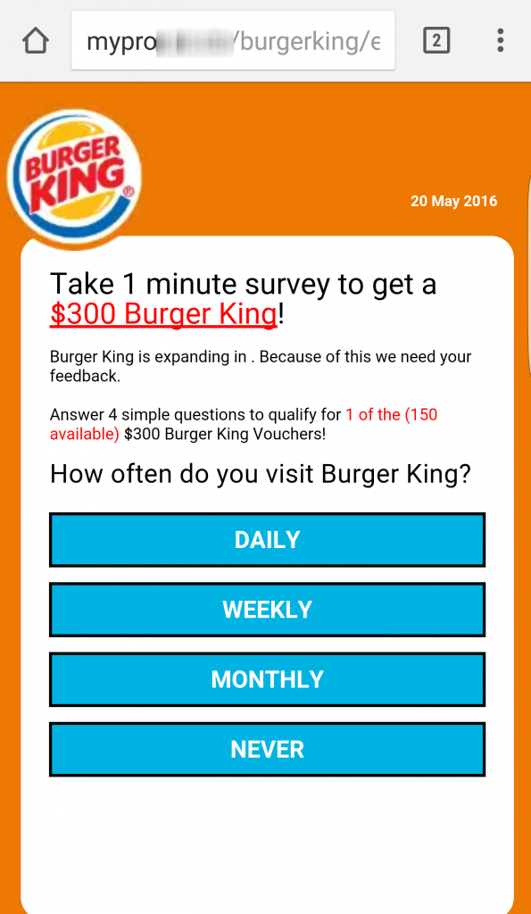 Just when it seemed that the latest round of scams via WhatsApp was coming to a close, ESET discovers a new one. This fake survey promises a chance at a discount coupon from Burger King, but ultimately ends by signing up victims to services that were not requested.