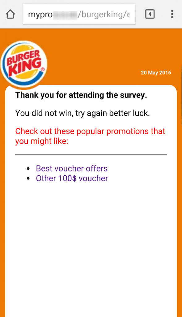 In the end, to the disappointment of all who ever thought that they might win vouchers, the attackers finish the scam by sending the following message: “Thank you for participating. You did not win; try again and good luck.”