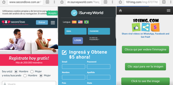 What happens internally (and unknown to the user) is multiple redirections that have different objectives: from generating clicks to giving a few cents to the author of the fraudulent campaign, to the registration of victim’s services that pay for getting new subscribers. The following screenshots show some of the services that you could get after the redirections:
