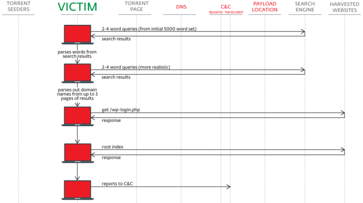 Note: Not every bot in the network is performing all the functions, some are just web crawlers, some just attack the XML-RPC API, and some do both. Also, not every bot seems to be seeding a torrent.