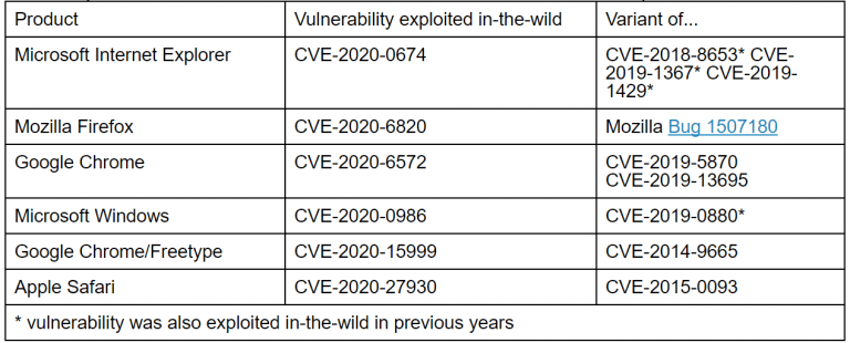 The list includes CVE-2020-0674, a zero-day that affected Internet Explorer and is a variant of CVE-2018-8653, CVE-2019-1367, and CVE-2019-1429, all three of which had previously been exploited in the wild.