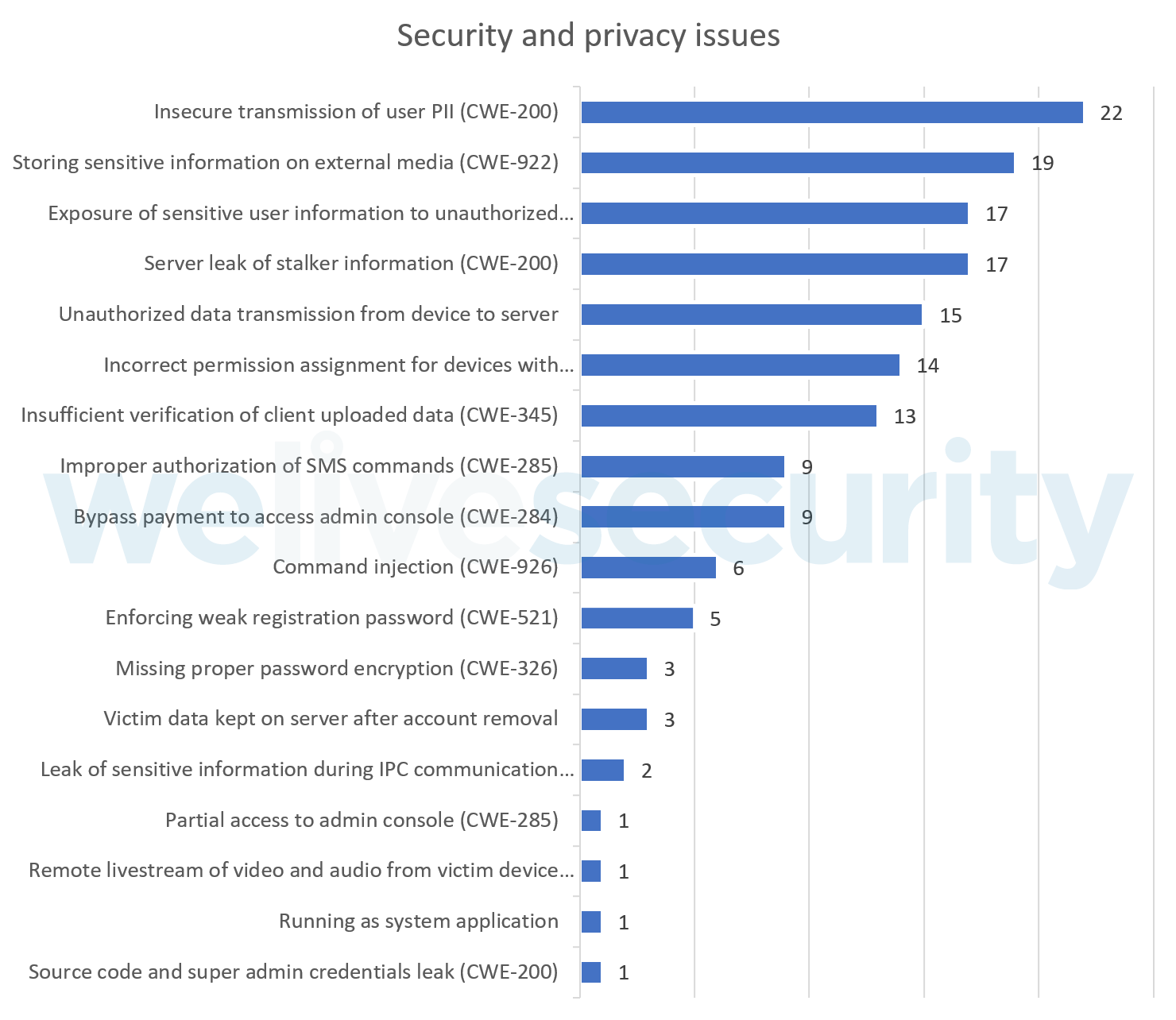 This analysis identified many serious security and privacy issues that could result in an attacker taking control of a victim’s device, taking over a stalker’s account, intercepting the victim’s data, framing the victim by uploading fabricated evidence, or achieving remote code execution on the victim’s smartphone. Across 58 of these Android applications we discovered a total of 158 security and privacy issues that can have a serious impact on a victim; indeed, even the stalker or the app’s vendor may be at some risk.