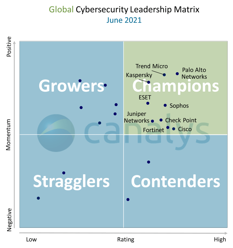 The 2021 Cybersecurity Leadership Matrix assessed 19 cybersecurity vendors on their global channel and market performance over the last 12 months. The Leadership Matrix combines partner feedback from Canalys’ Vendor Benchmark tool with an independent analysis of each vendor’s momentum in the channel based on their investments, strategy, market performance and execution.