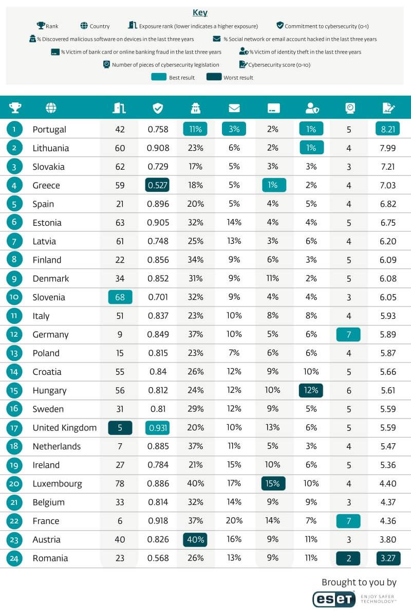 Portugal tops the list as the most cyber-safe region in Europe, boasting very low numbers of people who have fallen victim to malicious software, social media hacking, online banking fraud and identity theft. Coupled with legislation in five categories (national strategy, content, privacy, critical infrastructure and commerce), this earned Portugal its title as the best European country for cybersecurity.