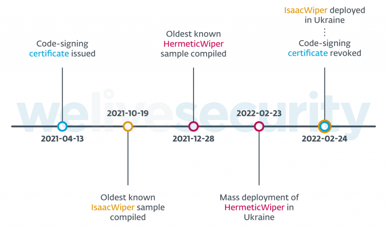 HermeticWizard for spreading on the local network, and HermeticRansom acting as a decoy ransomware. Malware artifacts suggest that the attacks had been planned for several months. As the Russian invasion started, a second destructive attack against a Ukrainian governmental network started, using a wiper that ESET Research has named IsaacWiper.