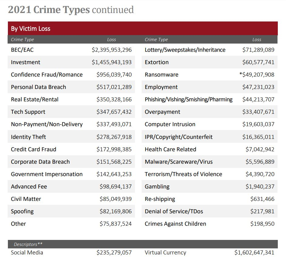 According to the aforementioned report, drawn up by the FBI’s Internet Crime Compliance Center (IC3), the IC3 received 19,954 BEC complaints last year. That actually makes it only the ninth most popular crime type of the year, far behind the leaders phishing (324,000), non-payment/non-delivery (82,000) and personal data breach (52,000). However, off the back of those nearly 20,000 BEC reports, scammers made an astonishing US$2.4 billion – far ahead of second and third-placed investment fraud (US$1.5 billion) and romance fraud (US$950 million).
