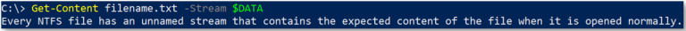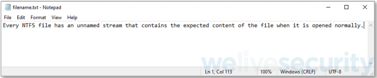 The filename, the stream name, and the stream type are joined and delimited by colons. Thus, in the eyes of NTFS, filename.txt is equivalent to filename.txt::$DATA. Notice how there is no stream name, only a file name and a stream type.