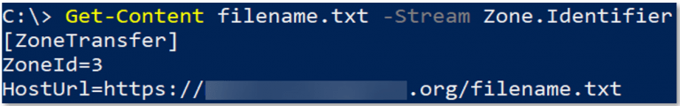 On the other hand, the file’s zone is contained in a stream that looks like this: filename.txt:Zone.Identifier:$DATA. The Zone.Identifier is a well-known stream name that modern browsers and some other applications automatically add or propagate to files to indicate their zone: the internet, the intranet, the trusted zone, the restricted zone, or the local machine. Some applications, such as the Chrome browser, add the host URL and the referrer URL to the Zone.Identifier as well: