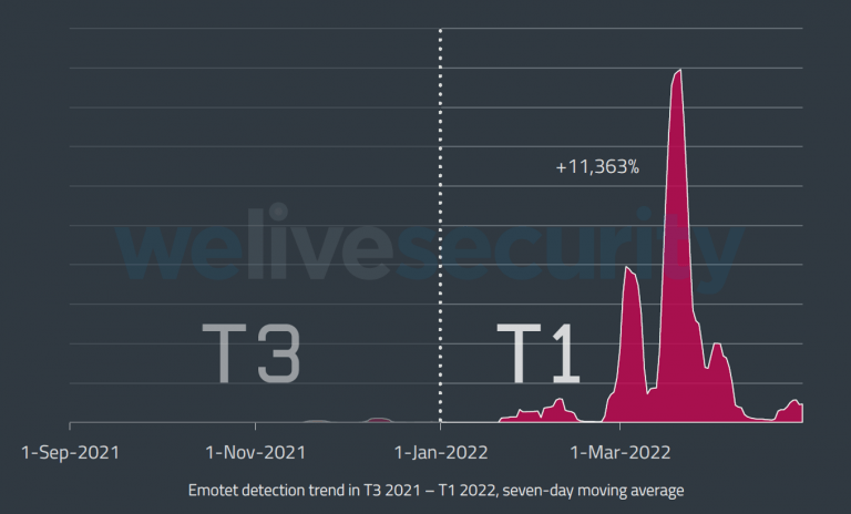 One of the key findings from the ESET Threat Report T1 2022 is that the Emotet botnet has risen, Phoenix-like, from the ashes, pumping out vast amounts of spam in March and April 2022, to the point that its detections grew more than a hundredfold in the first four months of 2022 compared to the last four months of 2021. Much of this activity involved Word documents tainted with malicious macros.