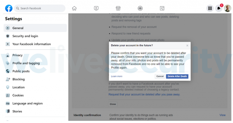 - You can choose to have your account deleted after you’re gone. This is a request you make to Facebook and that no one will be able to change. However, this requires that someone send a picture of your death certificate to Meta that informs them of your passing. Ensure that someone close to you know this is what you want and what they need to do when the moment comes.