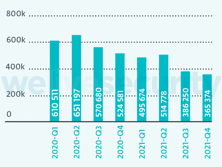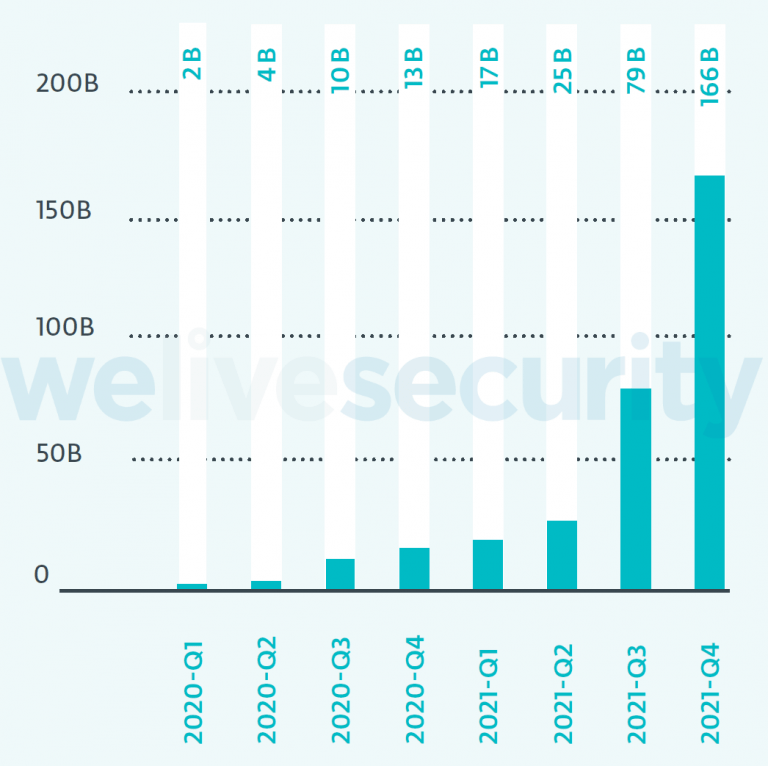Looking at two years’ worth of data from the beginning of 2020 to the end of 2021 would seem to agree with this assessment. During that period, ESET telemetry shows a massive increase in malicious RDP connection attempts. Just how large was the jump? In the first quarter of 2020, we saw 1.97 billion connection attempts. By the fourth quarter of 2021, that had jumped to 166.37 billion connection attempts, an increase of over 8,400%!