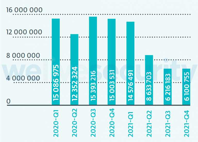 Looking at two years’ worth of data from the beginning of 2020 to the end of 2021 would seem to agree with this assessment. During that period, ESET telemetry shows a massive increase in malicious RDP connection attempts. Just how large was the jump? In the first quarter of 2020, we saw 1.97 billion connection attempts. By the fourth quarter of 2021, that had jumped to 166.37 billion connection attempts, an increase of over 8,400%!