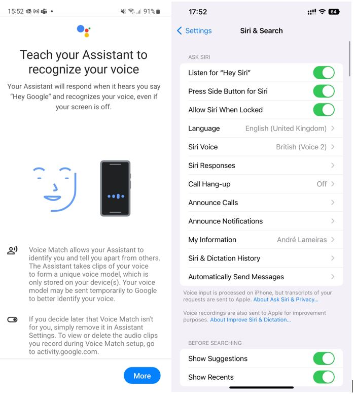 “Hey Google” or “Hey Siri” are simple commands you can use to interact with your phone’s voice assistant. In fact, these are voice recognition systems, responding only to your specific voice commands. When setting up your phone, you are asked to say some sentences out loud, allowing the algorithm to learn voice patterns that it will continue learning through real-world use. The more you talk to a virtual assistant, such as Google, Siri, or Alexa, the more it will recognize your voice patterns.
