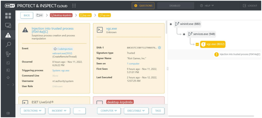 The discussions around this aggressive approach to the tech’s implementation and how players feel about the implications to the independent function of their PCs have been active. Although some may criticize anti-cheat software as spyware, putting the Vanguard client application under the microscope of a detection and response tool like ESET Inspect reveals a different picture. The ESET Inspect console only flags Vanguard injecting a thread into the virtual address space of the VALORANT process, thus giving Vanguard a deep look into VALORANT. Considering the purpose of anti-cheat software, this is an entirely unsuspicious action.