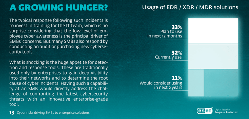 According to the 2022 ESET SMB Sentiment Survey , businesses prefer having an MSP take care of their security, or at least part of it. Furthermore, one third of SMBs are already using enterprise-grade solutions, such as XDR, EDR and MDR services, and another third are planning to start using them in the next year.