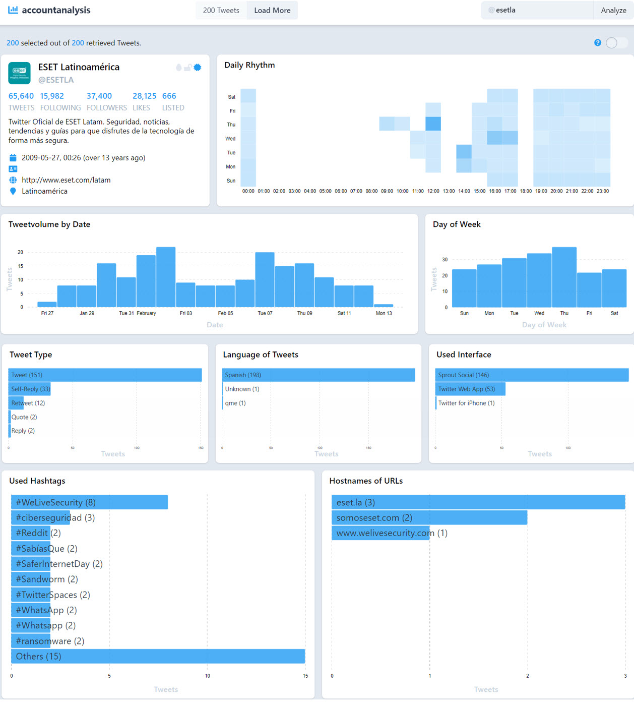 accountanalysis is used to perform OSINT research with a focus on Twitter. It produces a report that is a bird’s eye view of an account’s public information, including its followers and followed accounts, frequency of tweets, number of interactions, times of greatest activity, most used hashtags and many more.