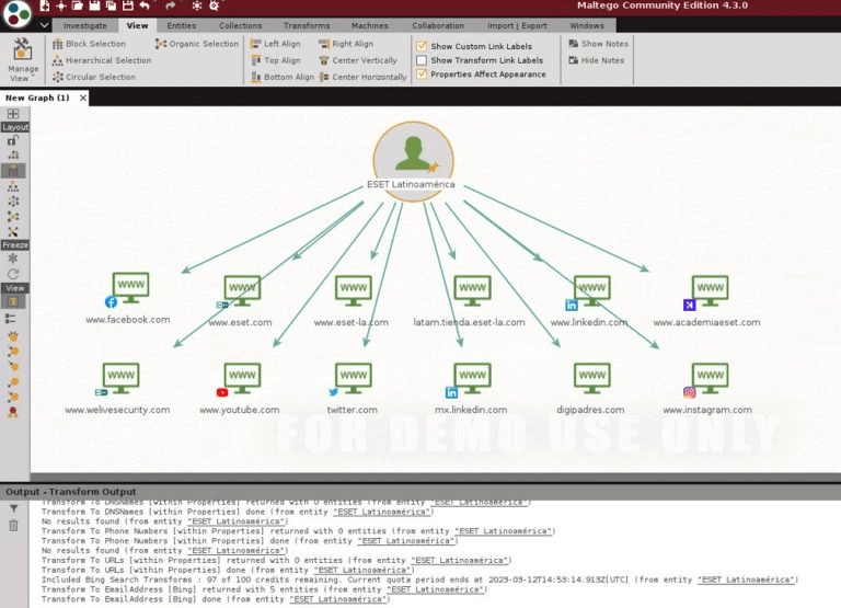 For example, in the following image we see some entities resulting from a search for “ESET Latinoamérica”. Among others, the tool returned ESET’s social networks and related sites, including WeLiveSecurity.