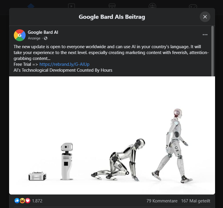 Today, while I was browsing through my Facebook feed, I came across an ad by “Google Bard AI”, suggesting to download and try out the latest version of Google’s legitimate AI tool “Bard”.