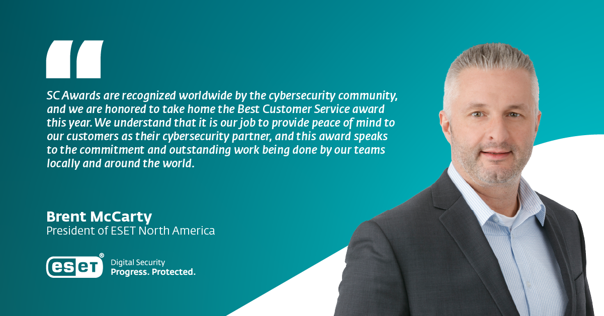 “SC Awards are recognized worldwide by the cybersecurity community, and we are honored to take home the Best Customer Service award this year,” said Brent McCarty, President of ESET North America. “This award speaks to both the transformation already underway and continued investment in our customer service organization, which has expanded with the vision of providing high-touch, localized customer support across time zones, channels, and languages. We understand that it is our job to provide peace of mind to our customers as their cybersecurity partner, and this award speaks to the commitment and outstanding work being done by our teams locally and around the world.”